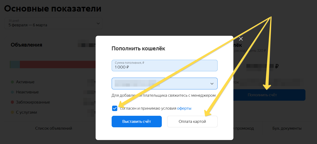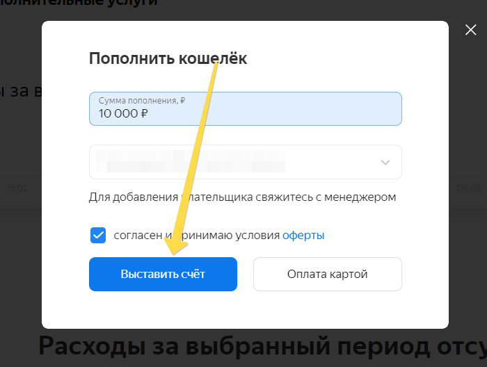В разделе Сводная или Кошелёк нажмите кнопку Пополнить счёт.