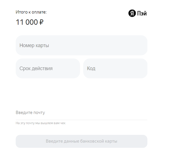 На открывшейся странице введите данные карты и укажите e-mail, на который придет чек.