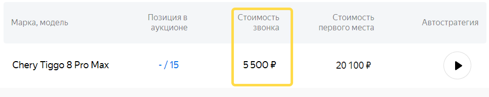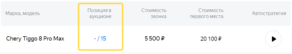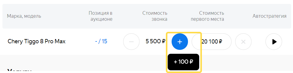 Увеличивая ставку за звонок или чат по конкретной модели, вы поднимаете ее выше в поисковой выдаче на сайте. Следите за своим местом в выдаче в колонке «Позиция в аукционе». Чтобы быстро стать лидером, нажмите на сумму в колонке «Стоимость первого места».