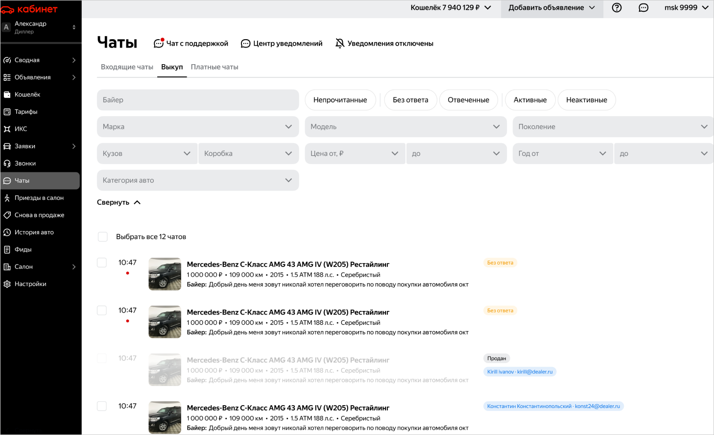 - Открывает чаты с частными продавцами на сайте Авто.ру от имени дилера.