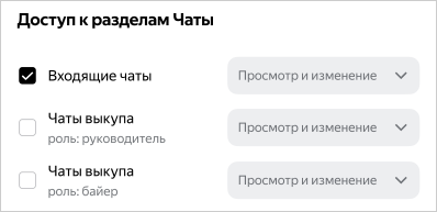 Права Администратора предоставляют полный функциональный доступ к разделу Чаты, поэтому при подключении к разделу новых учетных записей пользователей выбирайте роли с ограниченным доступом.