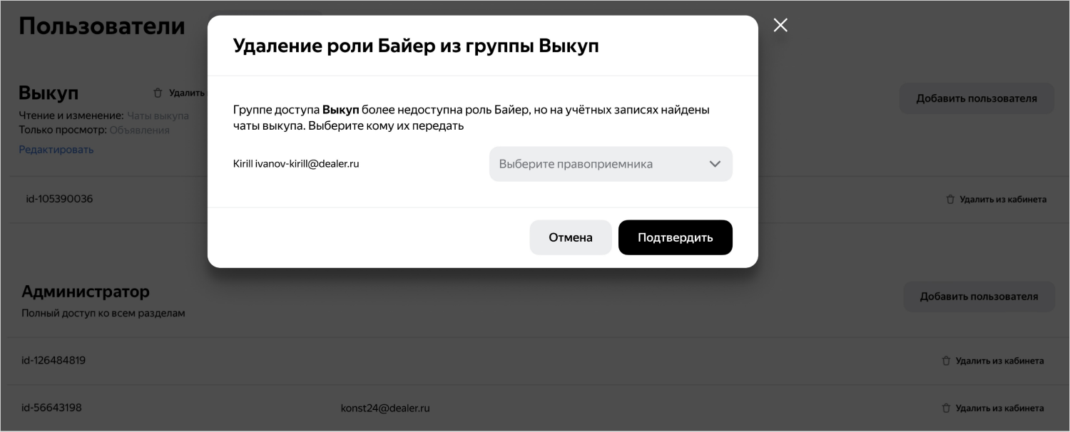 Перед тем, как отключить роль Байер в группе доступа с привязанными учетными записями пользователей, для каждой привязанной учетной записи с ранее созданными чатами выкупа выберите правопреемника.