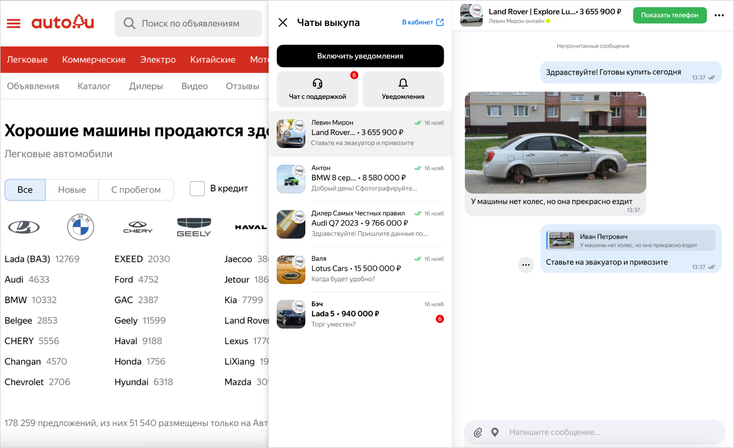 - возможность открывать чаты с частными продавцами на сайте Авто.ру.