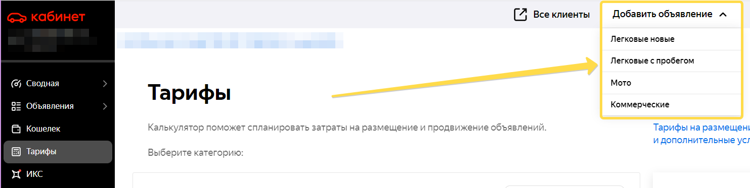 Нажать на кнопку «Добавить объявление» на главной странице, затем выбрать подходящую категорию транспорта.