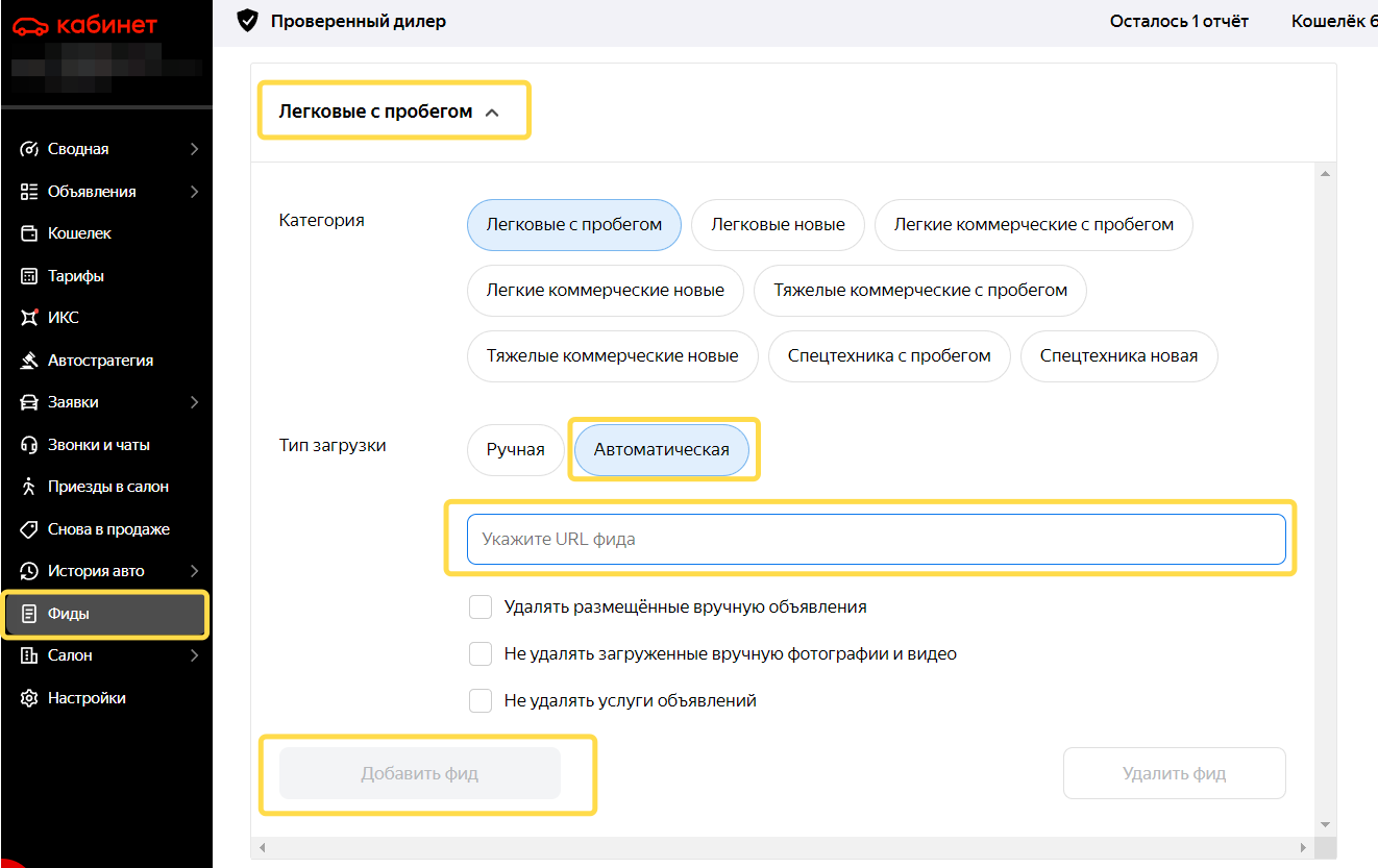 Нельзя одновременно использовать два типа загрузки для одной категории ТС. Например: если вы добавили фид в категории Легковые с пробегом с типом загрузки Автоматический, то загрузить еще один в этой же категории, но вручную, не получится.