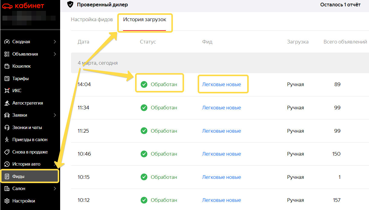 Ручная загрузка фида подразумевает, что вы один раз составляете его и добавляете на Авто.ру. Чтобы изменить объявления, нужно будет отредактировать фид и загрузить заново.