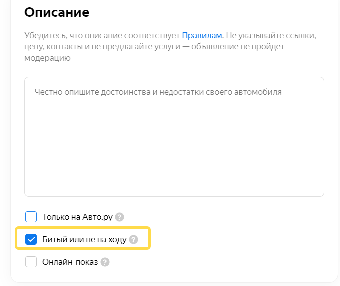 Указывать статус «Битый или не на ходу», если машина нуждается в ремонте. Например у нее: