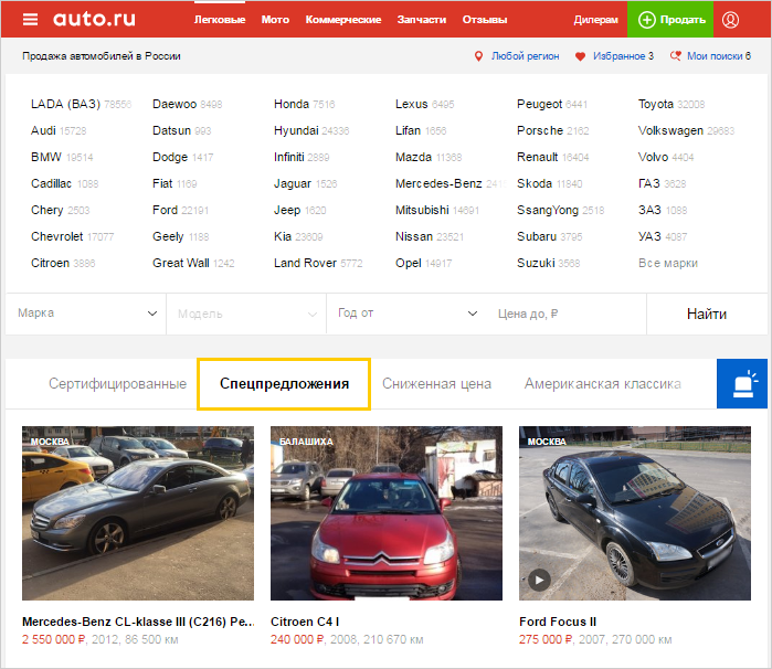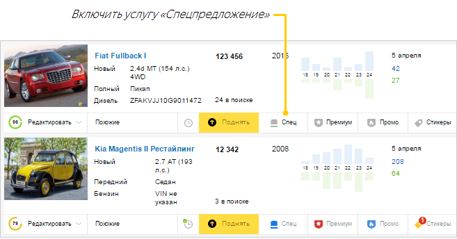 Объявление отображается в специальном блоке Спецпредложения на страницах поисковой выдачи по марке и на карточках объявлений о продаже аналогичных авто. Для легковых — также на главной странице и в каталоге.