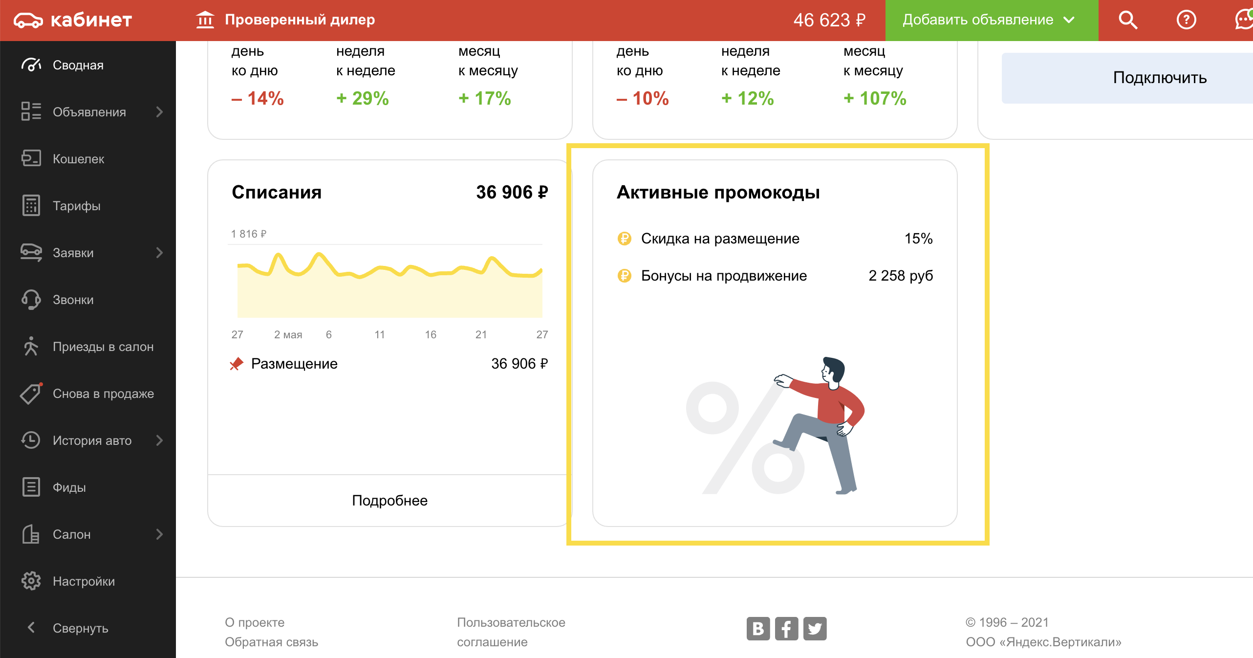 Если вы выполнили все условия статуса, в начале каждого месяца к карточке автоматически применится промокод. Вы сможете оплачивать им услуги активации и/или продвижения объявлений только в категории «Легковые с пробегом». Услуги, оплаченные промокодом, не отображаются в статистике списаний.