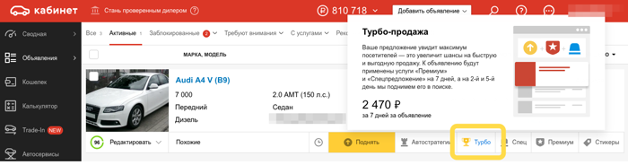 Ваше предложение увидит максимум посетителей — это увеличит шансы на быструю и выгодную продажу. К объявлению будут применены услуги «Премиум» и «Спецпредложение» на 7 дней, а на 1-й, 3-й и 5-й день мы поднимем его в поиске.