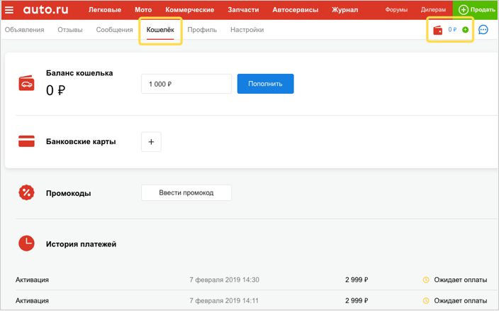 Можно оплачивать каждую опцию отдельно, пополнять кошелёк на Авто.ру или привязать к личному кабинету банковскую карту.
